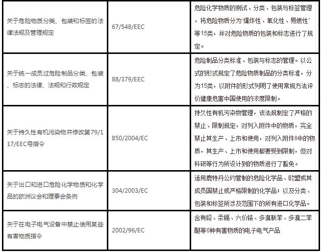 第二階段是1967-2001年,在歐洲共同體成立后,建立了“舊”化學品管理體系。這是由不同歷史時期的指令和制度拼湊起來的;并先后通過發(fā)布了67/548/EEC指令(危險化學品的分類、包裝及標注)、88/379/EEC指令(危險制劑的分類、包裝和標注)、76/769/EEC指令(某些危險物質(zhì)和制劑限制銷售和使用)、793/93/EEC指令(現(xiàn)有物質(zhì)危險性評估和控制)等。
