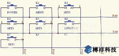 由于ST20P18的I/O口有限,故在鍵盤(pán)電路中采用掃描的方式來(lái)實(shí)現(xiàn)。該電路的實(shí)現(xiàn)方式如圖2所示。其工作的基本原理是:?jiǎn)纹瑱C(jī)初始化后先設(shè)置 PA0至PA5、6個(gè)I/O口均為輸入方式。