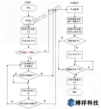開(kāi)機(jī)后,先進(jìn)行初始化,包括對(duì)單片機(jī)的初始化、LCD的初始化和其他模塊的初始化。出于省電的考慮在40s內(nèi)若沒(méi)有鍵按下,讓單片機(jī)的LCD控制器進(jìn)入空閑模式。用“for”循環(huán)來(lái)計(jì)時(shí),并設(shè)計(jì)初值為零。