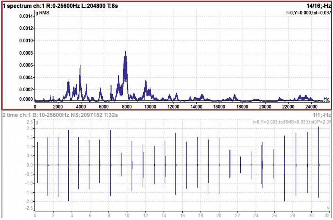 在圖1中,您可以看到頻譜和時間信號(在低速軸承上測量)。范圍是25 kHz。所有更***幅度的線都在2 kHz或更***的范圍內(nèi)。請注意頻譜中極低的g振幅。頻譜顯示信號的能量。在此信號中,我們只會看到?jīng)]有明顯能量的沖擊。這就是頻譜顯示極低值的原因。