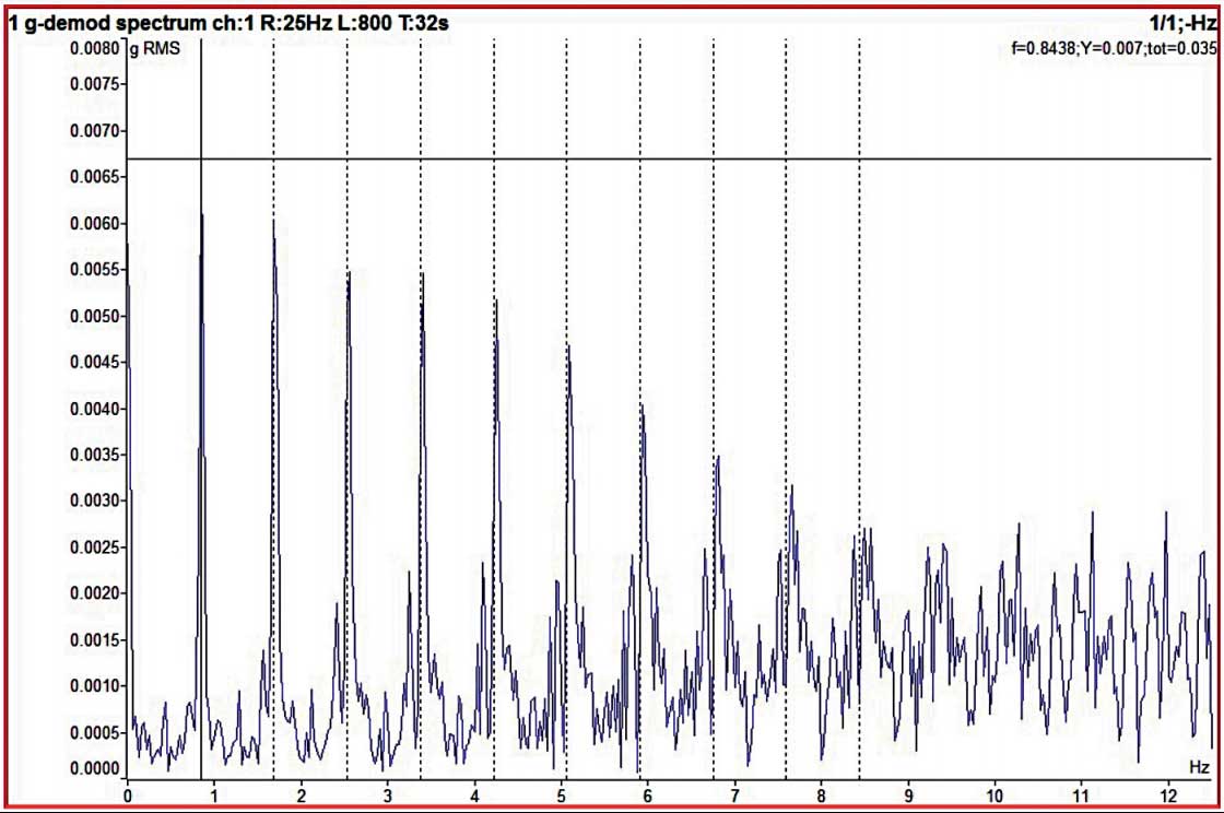 在圖2中,我們僅在25 Hz范圍內(nèi)測量了頻譜。該軸承的沖擊重復(fù)頻率約為1 Hz。在1 Hz附近看不到任何東西。如果要查看頻譜中的重復(fù)頻率,則必須應(yīng)用解調(diào)。這意味著,我必須補充精力。解調(diào)后的頻譜可以顯示可見的東西。解調(diào)頻譜使用包絡(luò)的時間信號。我們只想在500 Hz至25 kHz的頻段內(nèi)進行測量。我們對低頻不感興趣。您可以想象包絡(luò)就像簡單的電路:沖擊來了,給電容器充電,然后電容器通過電阻放電。放電時間比原始震動的時間長得多。這是在頻譜方面幫助我們的額外能量。確實有幫助。在第三張圖片中,您可以看到重復(fù)頻率0.85 Hz及其諧波。諧波總是會發(fā)生,因為包絡(luò)信號失真。這不是純正弦波,它只能顯示光譜中的一條線。我希望您在低速機器上進行測量時會記得這篇文章,并希望您現(xiàn)在能夠更有效地檢查這些機器。